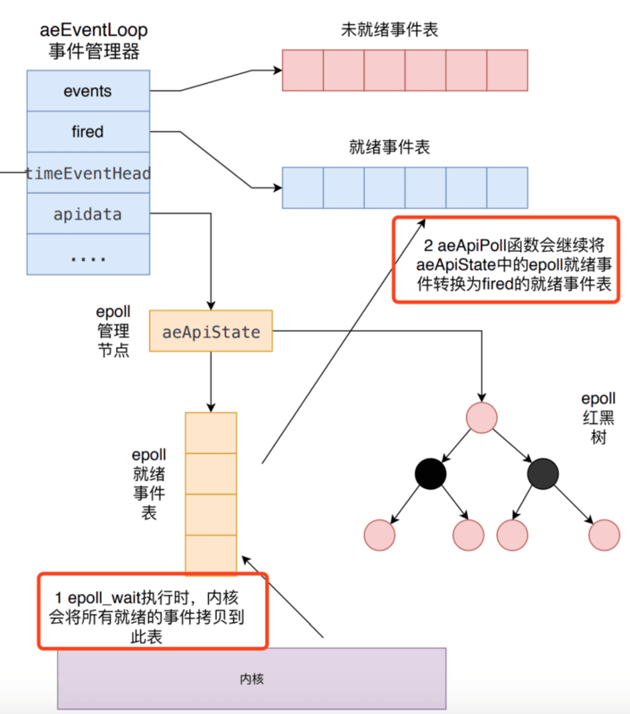 事件驱动库的代码主要是在src/ae.c中实现的,其示意图如下所示。