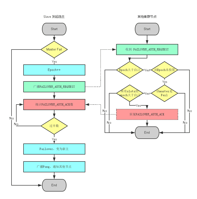 当slave发现自己的master变为FAIL状态时,便尝试进行Failover,以期成为新的master。由于挂掉的master可能会有多个slave。Failover的过程需要经过类Raft协议的过程在整个集群内达到一致, 其过程如下: