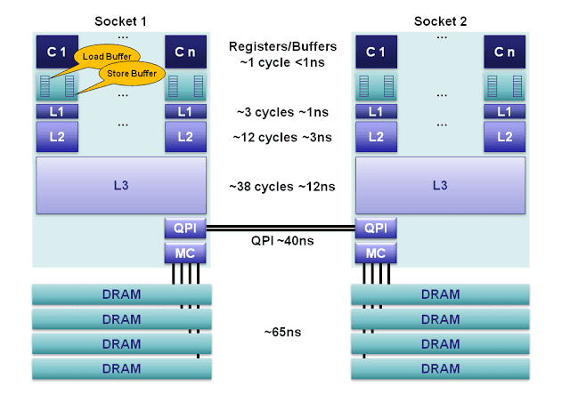内存控制器芯片被集成到处理器内部,多个处理器通过QPI链路相连,DRAM也就有了远近之分。(如下图所示:摘自CPU Cache 在新窗口打开 (opens new window))