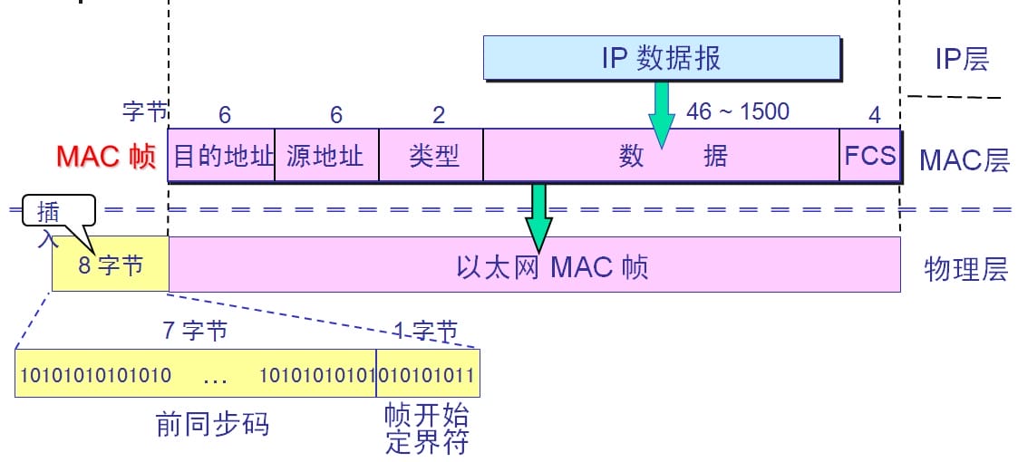 为了达到比特同步,在传输媒体上实际传送的要比 MAC 帧还多 8 个字节。(指的就是前面的八个字节)