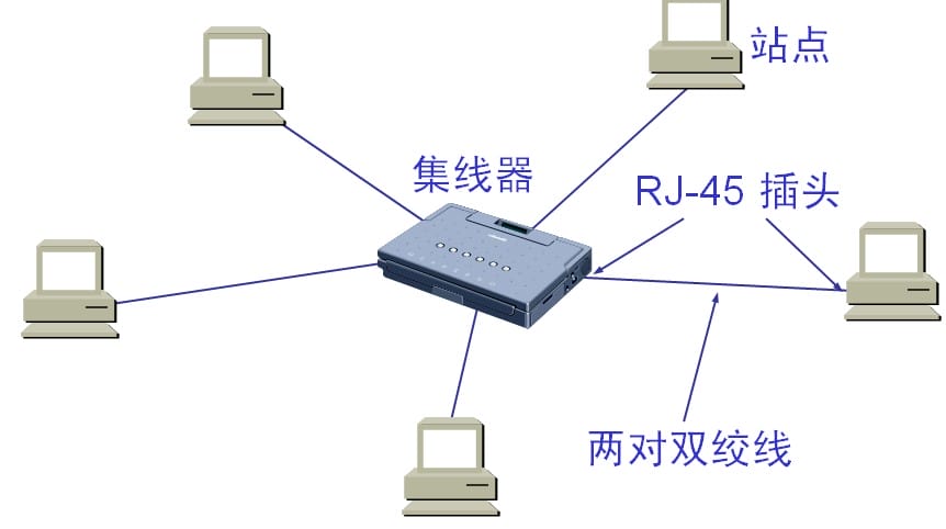 扩展主机和集线器之间的距离,主机使用光纤和一对光纤调制解调器(进行电信号和光信号的转换)连接到集线器