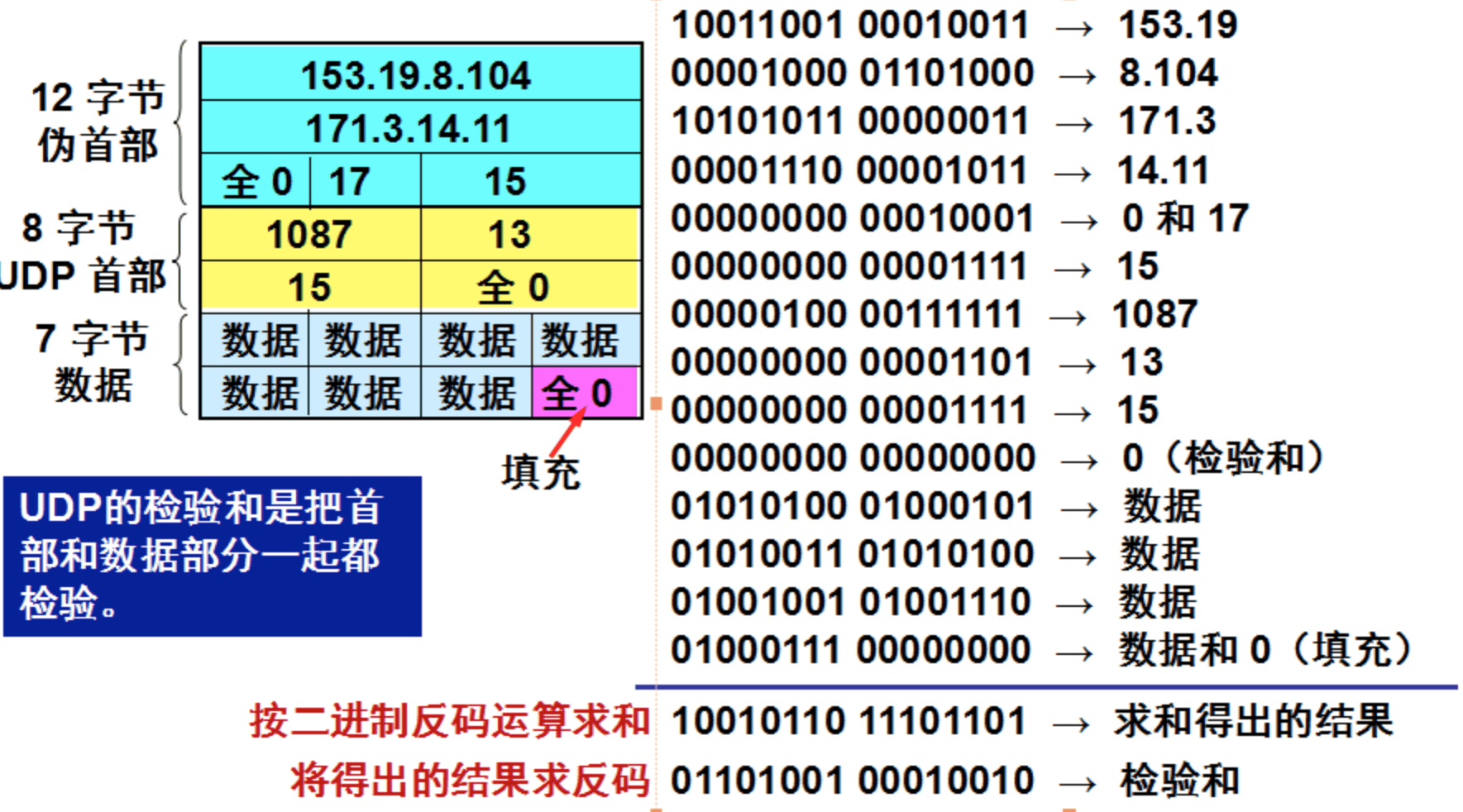 - 校验时,若UDP数据报部分的长度不是偶数个字节,则需要填入一个全0字节,但是次字节和伪首部一样,是不发送的。