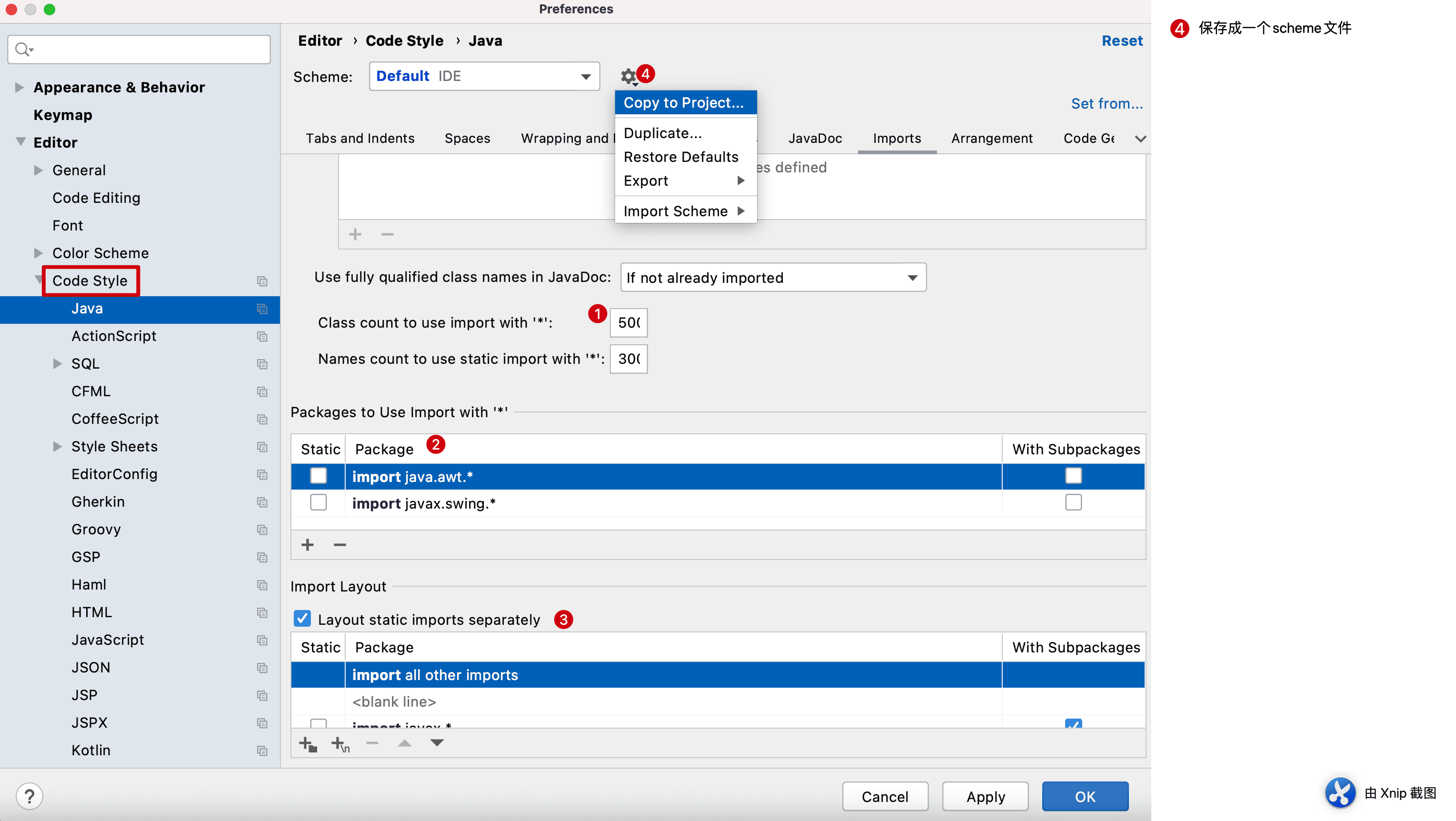 通常而言,注意下这里几步(当然你可以设置更多,特意截图这几步,主要考虑checkstyle的要求及imports化在不同IDE下的差异),然后保存我一个scheme放到项目根目录下,供所有队员统一使用