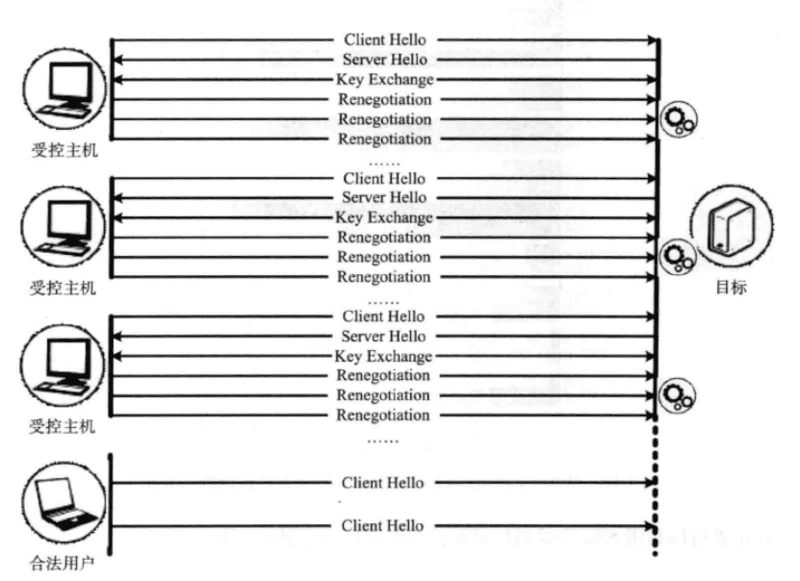 在进行SSL握手的过程中,服务器会消耗较多的CPU计算资源进行加解密,并进行数据的有效性检验,对于客户端发过来的数据,服务器需要先花费大量的计算资源进行解密,之后才能对数据的有效性进行检验,重要的是,不论数据是否是有效的,服务器都必须先进行解密才能够做检查,攻击者可以利用这个特性进行SSL洪水攻击。
