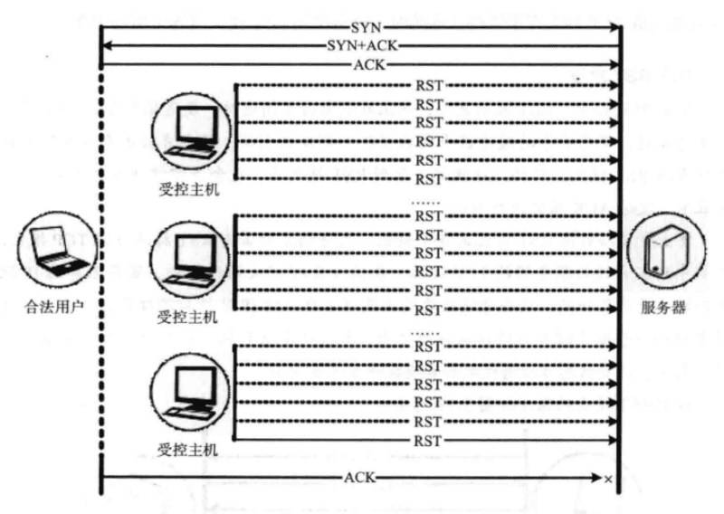 在建立TCP连接的过程中,如果在服务器返回SYN+ACK报文后,客户端由于某种原因没有对其进行确认,这时服务器端就需要重传SYN+ACK报文,并等待客户端的确认报文直到TCP连接超时,这种等待客户确认的连接状态通常被称为半开连接。 在连接超时之前,半开连接会一直保存在服务器的连接表中。 由于连接表的大小是有限的,如果在短时间内产生大量的半开连接,而这些连接又无法很快的结束,连接表就会很快被占满,导致新的连接TCP连接无法建立。