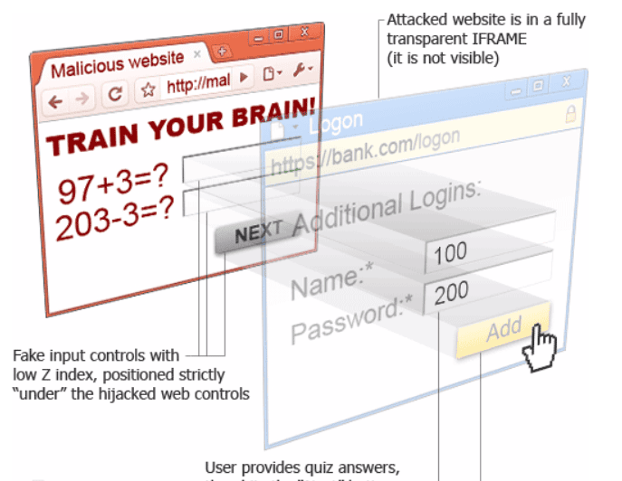 点击劫持是一种恶意技术,欺骗网络用户点击与用户认为他们点击的内容不同的内容,从而可能在点击看似无害的网页时泄露机密信息。〜维基百科