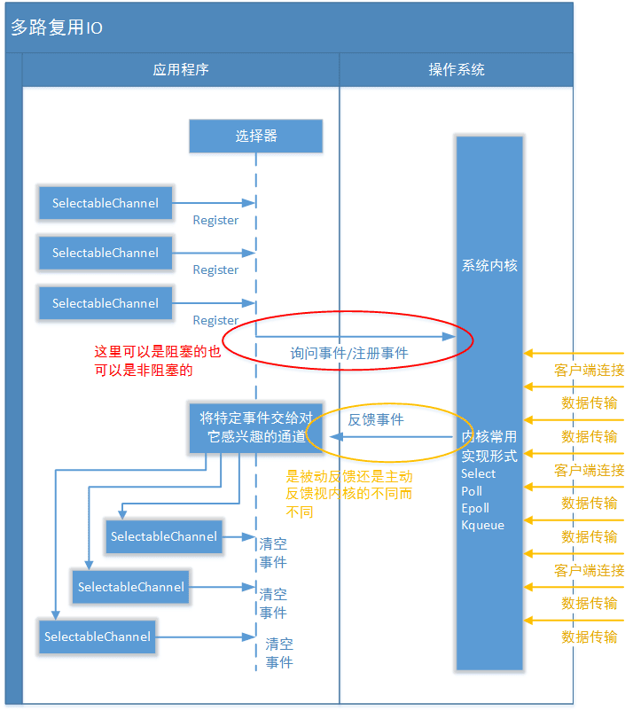 操作系统级别的优化: 多路复用IO技术可以是操作系统级别在一个端口上能够同时接受多个客户端的IO事件。同时具有之前我们讲到的阻塞式同步IO和非阻塞式同步IO的所有特点。Selector的一部分作用更相当于"轮询代理器"。