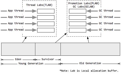 其中,应用线程可以独占一个本地缓冲区(TLAB)来创建的对象,而大部分都会落入Eden区域(巨型对象或分配失败除外),因此TLAB的分区属于Eden空间;而每次垃圾收集时,每个GC线程同样可以独占一个本地缓冲区(GCLAB)用来转移对象,每次回收会将对象复制到Suvivor空间或老年代空间;对于从Eden/Survivor空间晋升(Promotion)到Survivor/老年代空间的对象,同样有GC独占的本地缓冲区进行操作,该部分称为晋升本地缓冲区(PLAB)。