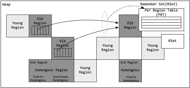 事实上,并非所有的引用都需要记录在RSet中,如果一个分区确定需要扫描,那么无需RSet也可以无遗漏的得到引用关系。那么引用源自本分区的对象,当然不用落入RSet中;同时,G1 GC每次都会对年轻代进行整体收集,因此引用源自年轻代的对象,也不需要在RSet中记录。最后只有老年代的分区可能会有RSet记录,这些分区称为拥有RSet分区(an RSet's owning region)。