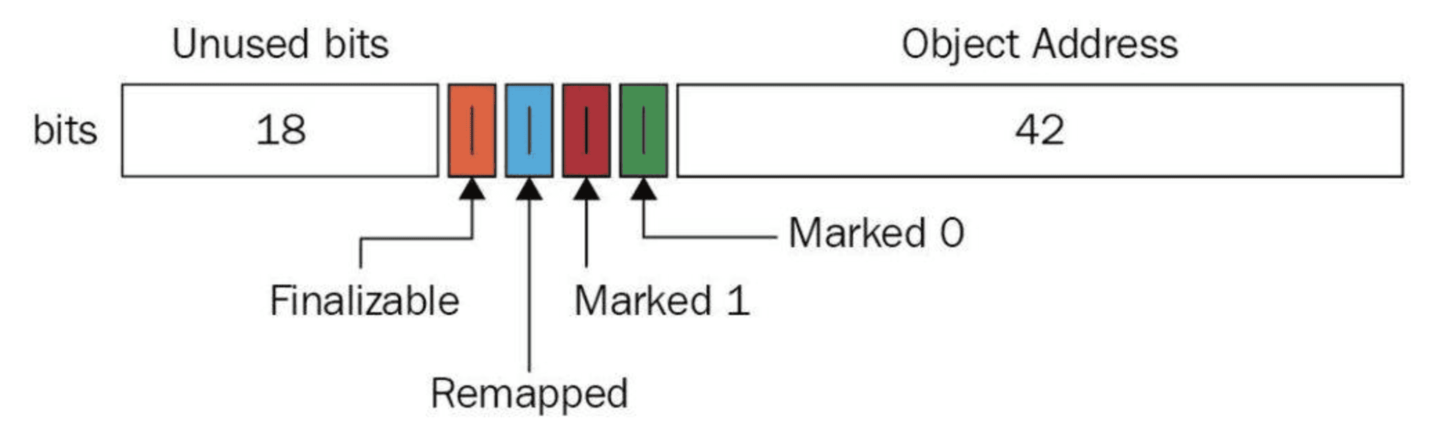 与上述地址空间划分相对应,ZGC实际仅使用64位地址空间的第0~41位,而第42~45位存储元数据,第47~63位固定为0。
