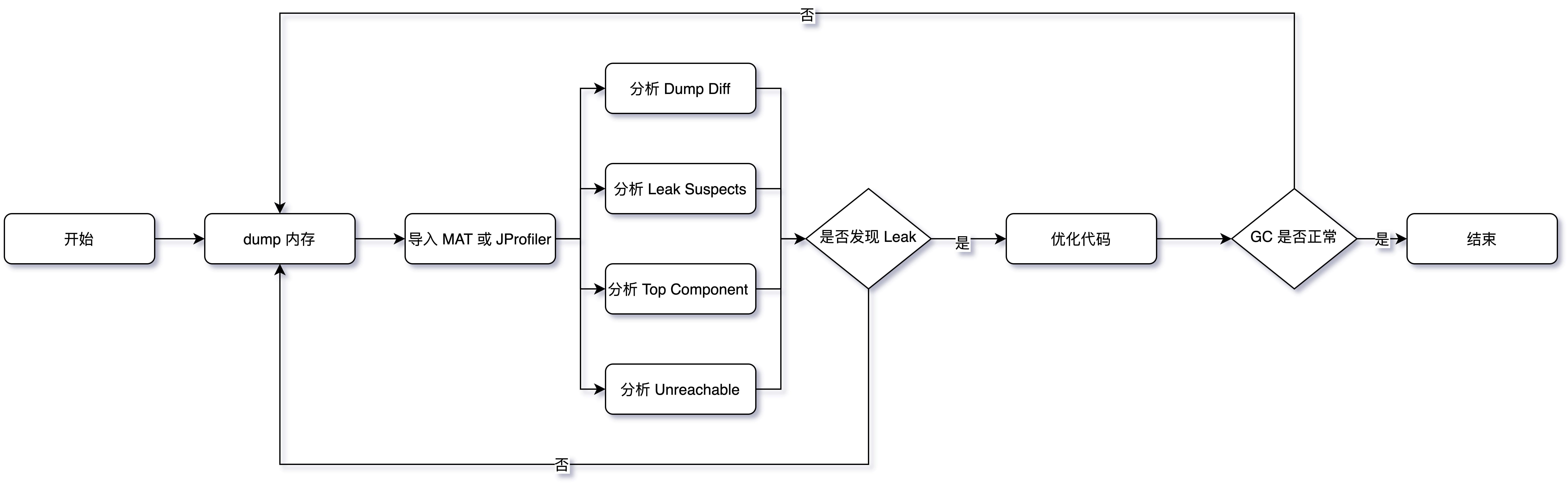 下图为整体 GC 问题普适的处理流程,重点的地方下面会单独标注,其他的基本都是标准处理流程,此处不再赘述,最后在整个问题都处理完之后有条件的话建议做一下复盘。