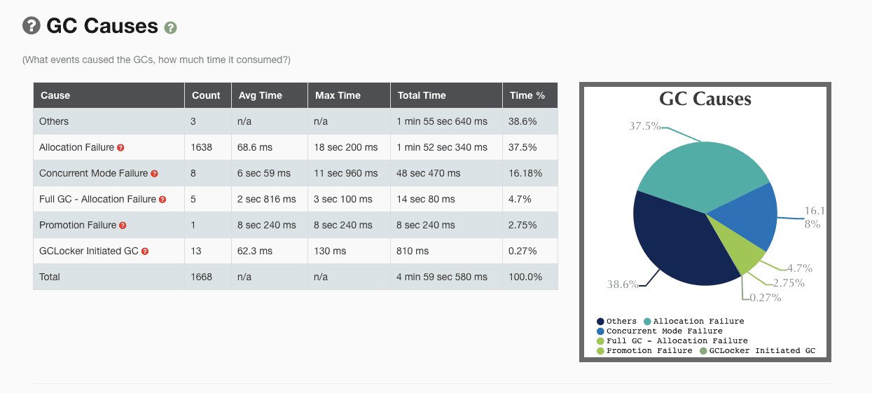 拿到 GC 日志,我们就可以简单分析 GC 情况了,通过一些工具,我们可以比较直观地看到 Cause 的分布情况,如下图就是使用 gceasy 绘制的图表: