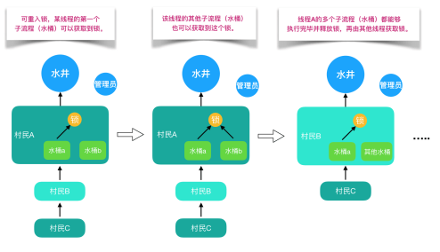 还是打水的例子,有多个人在排队打水,此时管理员允许锁和同一个人的多个水桶绑定。这个人用多个水桶打水时,第一个水桶和锁绑定并打完水之后,第二个水桶也可以直接和锁绑定并开始打水,所有的水桶都打完水之后打水人才会将锁还给管理员。这个人的所有打水流程都能够成功执行,后续等待的人也能够打到水。这就是可重入锁。