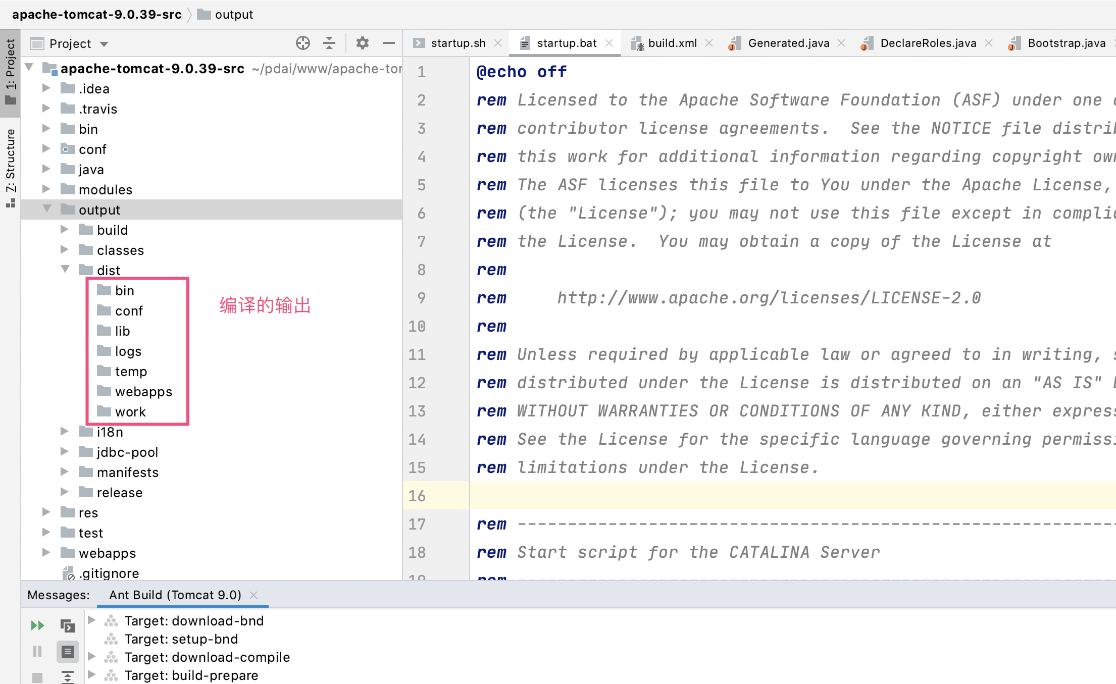 当我们初学tomcat的时候, 肯定先要学习怎样启动tomcat. 在tomcat的bin目录下有两个启动tomcat的文件, 一个是startup.bat, 它用于windows环境下启动tomcat; 另一个是startup.sh, 它用于linux环境下tomcat的启动. 两个文件中的逻辑是一样的, 我们只分析其中的startup.bat.