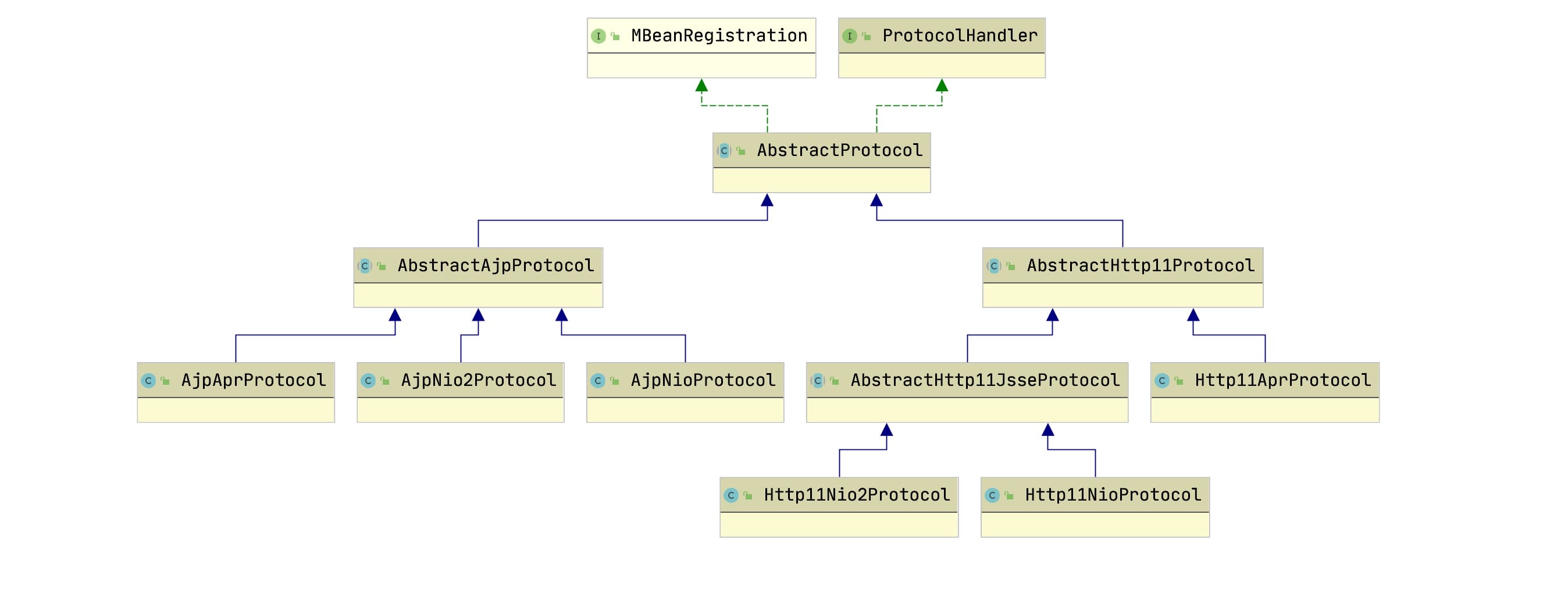 我们看到上述方法实际通过Protocol初始化了ProtocolHandler, 我们看下它所支持的HTTP1.1,Ajp协议的处理,我们通过它的类层次结构来看协议支持处理类