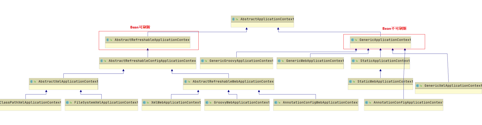 AbstractRefreshableApplicationContext : AbstractRefreshableApplicationContext及子类的每次refresh都是先清除已有(如果不存在就创建)的容器,然后再重新创建;AbstractRefreshableApplicationContext及子类无法做到GenericApplicationContext混合搭配从不同源头获取bean的定义信息