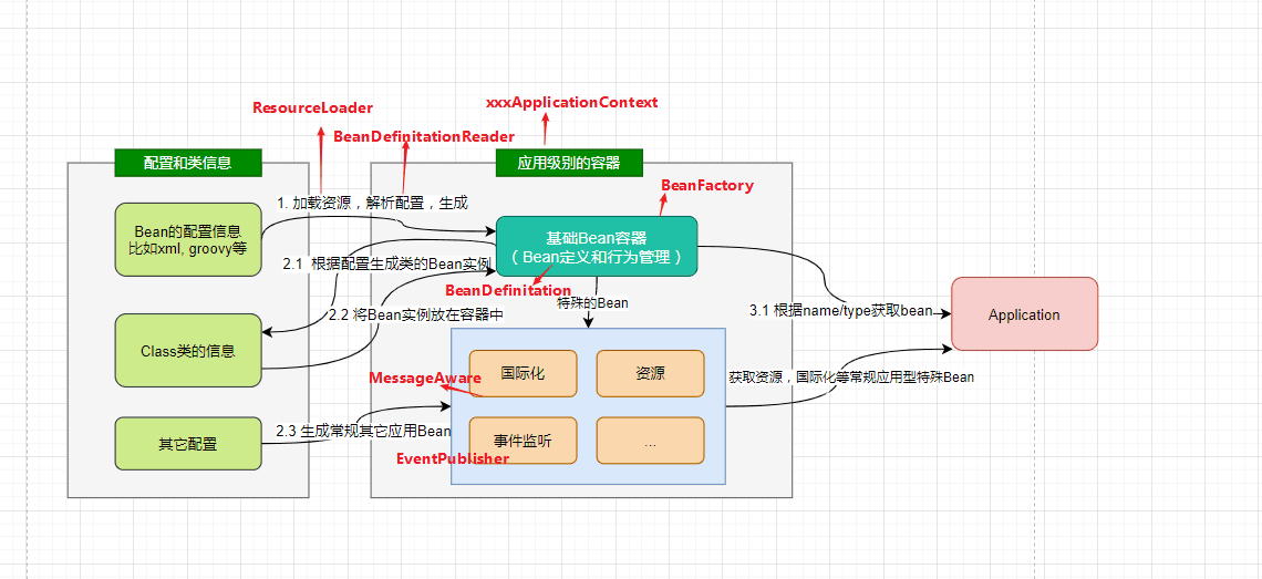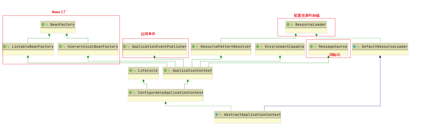 - HierarchicalBeanFactory 和 ListableBeanFactory: ApplicationContext 继承了 HierarchicalBeanFactory 和 ListableBeanFactory 接口,在此基础上,还通过多个其他的接口扩展了 BeanFactory 的功能: