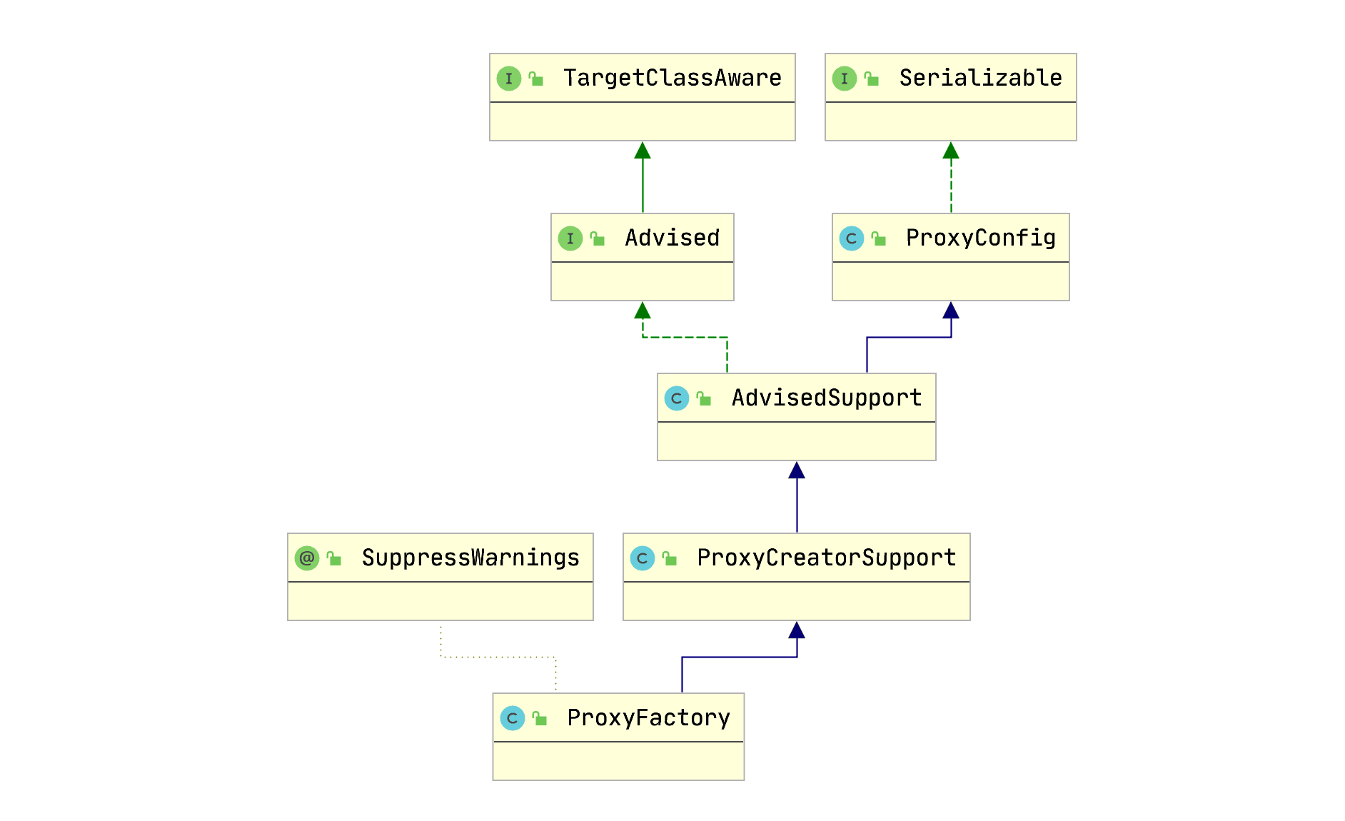 - 上文我们介绍了Spring AOP原理解析的切面实现过程(将切面类的所有切面方法根据使用的注解生成对应Advice,并将Advice连同切入点匹配器和切面类等信息一并封装到Advisor)。本文在此基础上继续介绍,代理(cglib代理和JDK代理)的实现过程。