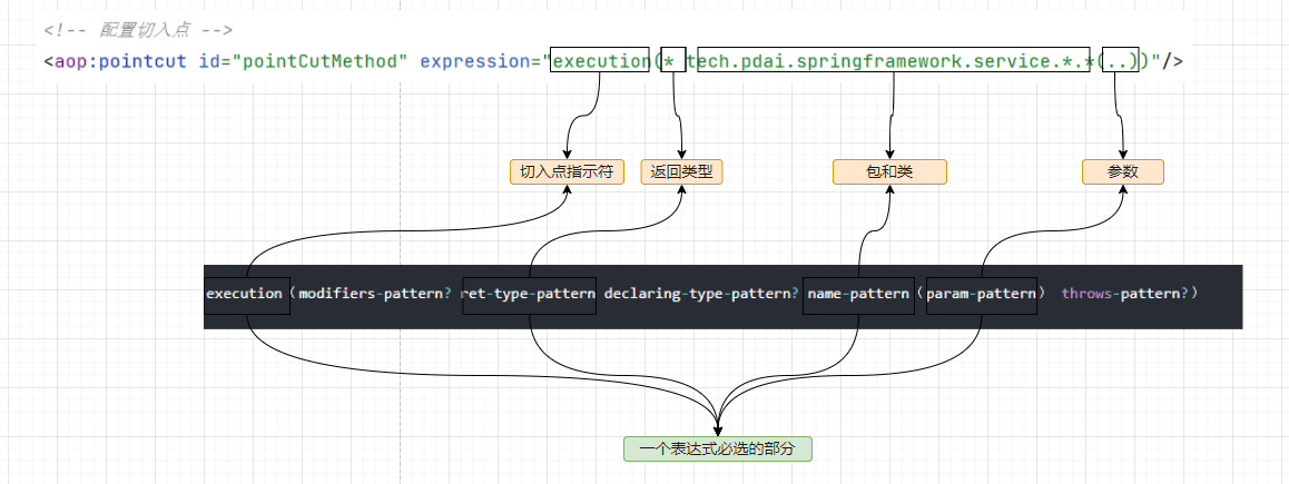 Spring AOP 用户可能会经常使用 execution切入点指示符。执行表达式的格式如下: