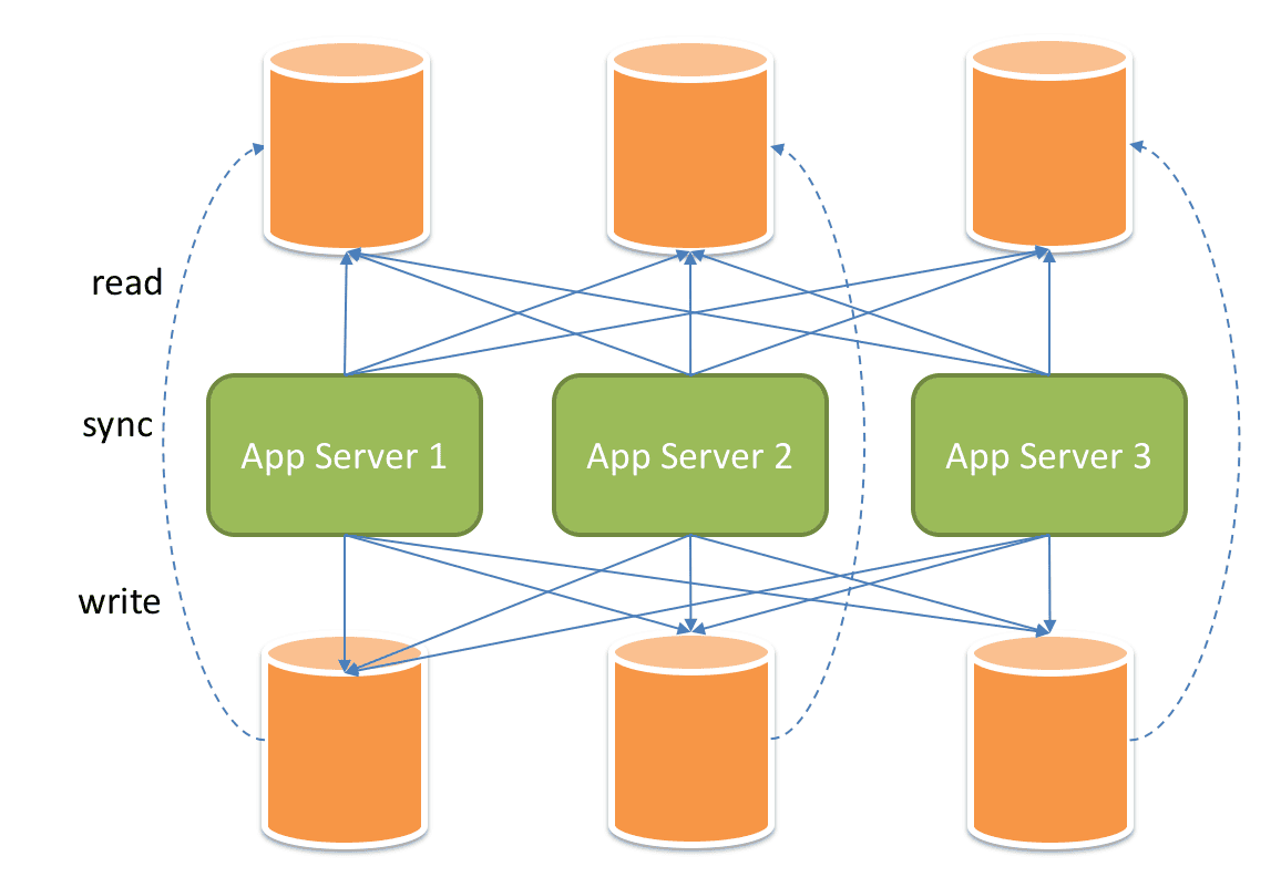 读写分离虽然可以提升系统的吞吐量和可用性,但同时也带来了数据不一致的问题。 这包括多个主库之间的数据一致性,以及主库与从库之间的数据一致性的问题。 并且,读写分离也带来了与数据分片同样的问题,它同样会使得应用开发和运维人员对数据库的操作和运维变得更加复杂。 下图展现了将分库分表与读写分离一同使用时,应用程序与数据库集群之间的复杂拓扑关系。