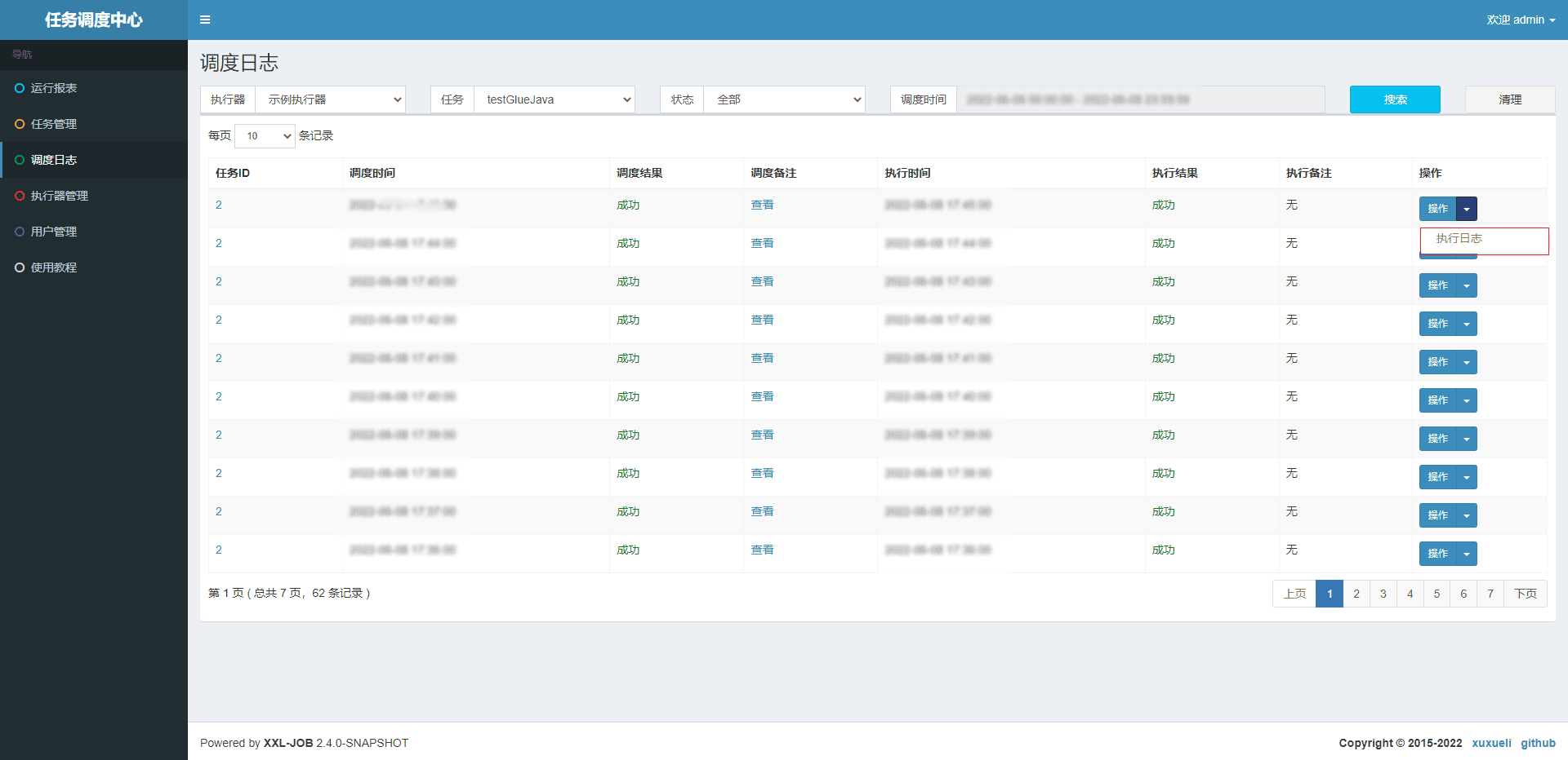- 支持可视化、简单且动态的管理调度信息,包括任务新建,更新,删除,GLUE开发和任务报警等,所有上述操作都会实时生效,同时支持监控调度结果以及执行日志,支持执行器Failover。