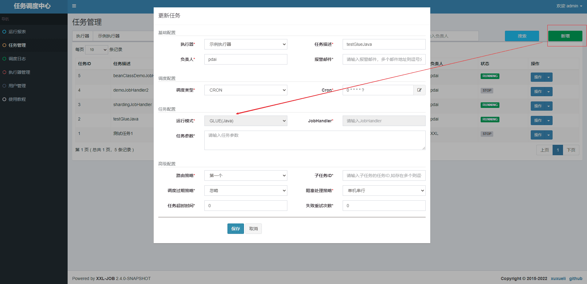 - GLUE模式(NodeJS):任务以源码方式维护在调度中心;该模式的任务实际上是一段 "nodejs" 脚本;