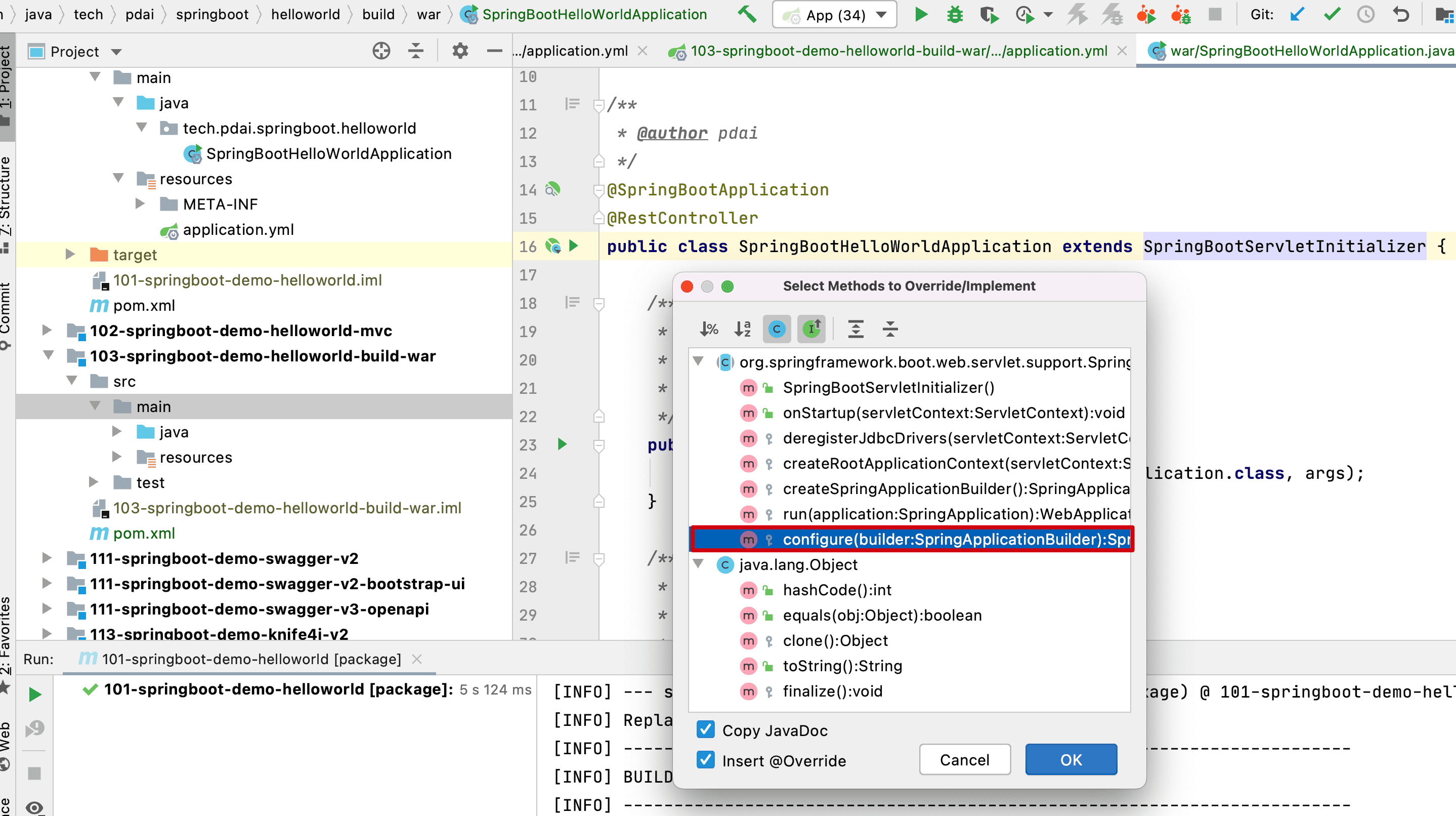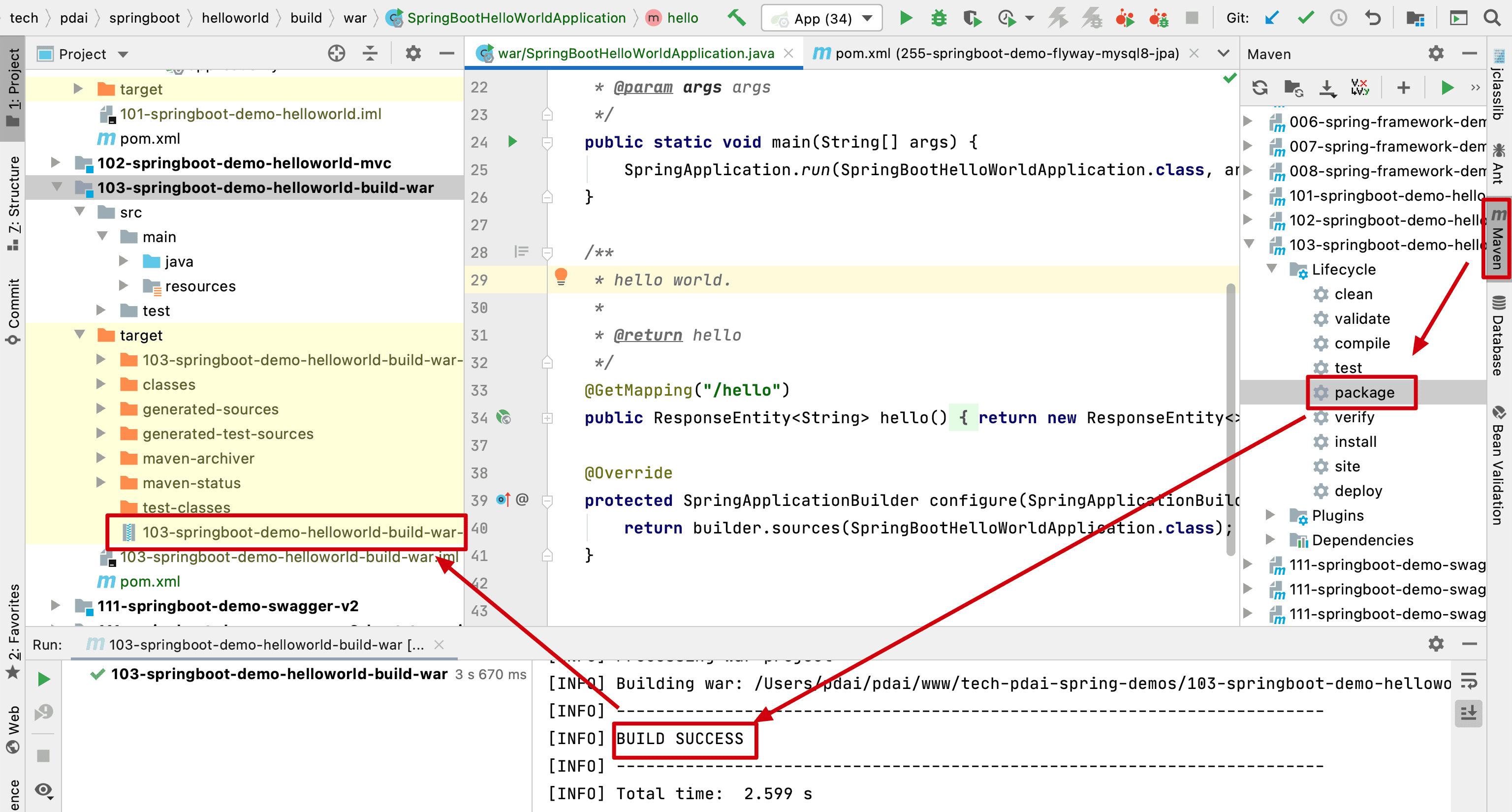 这里以一个Helloworld项目(SpringBoot入门 - 创建第一个Hello world工程)为例打包成war。