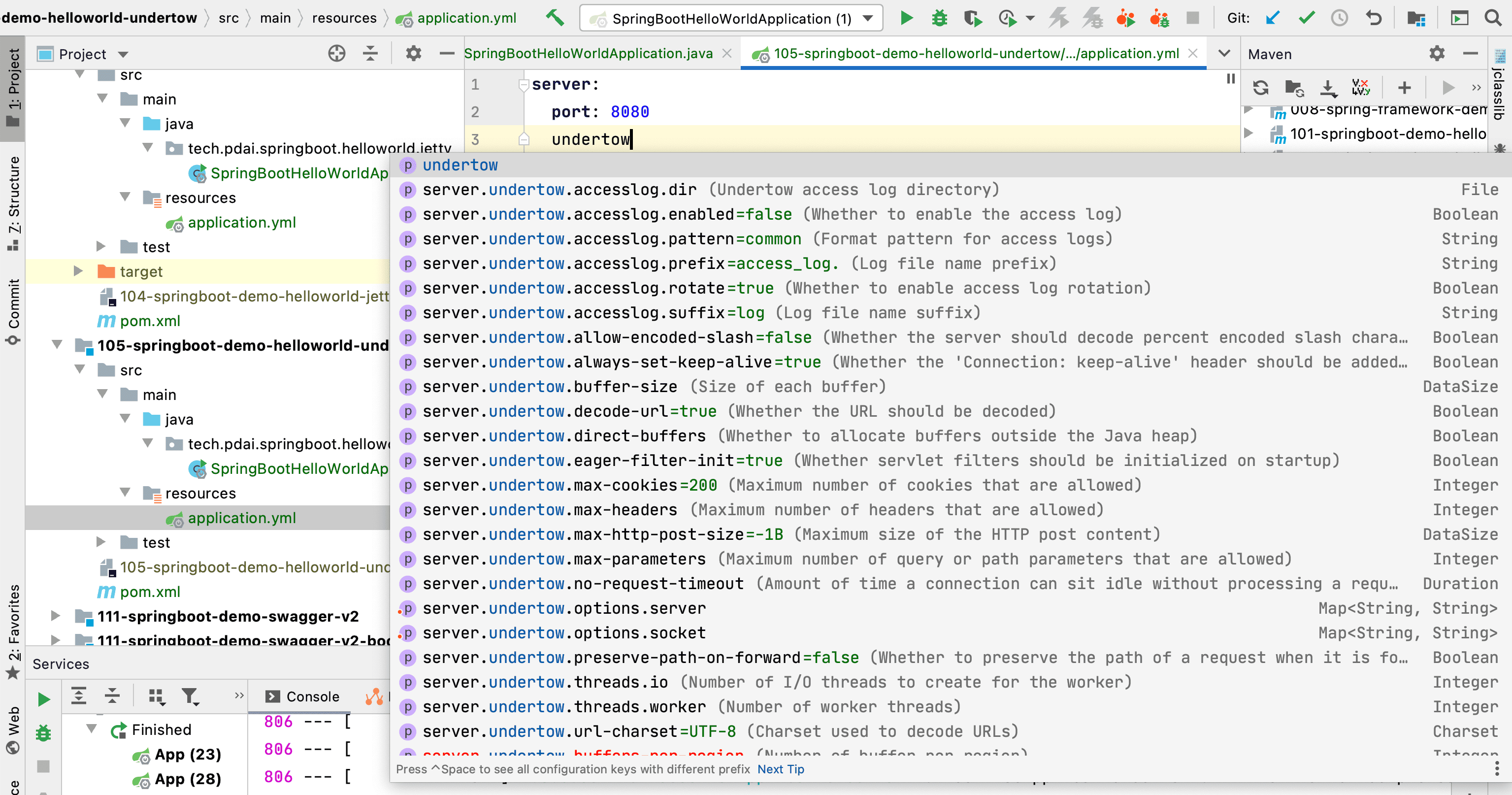 这里以一个Helloworld项目(SpringBoot入门 - 创建第一个Hello world工程)为例,在此基础上移除内嵌的Tomcat并使用Undertow。