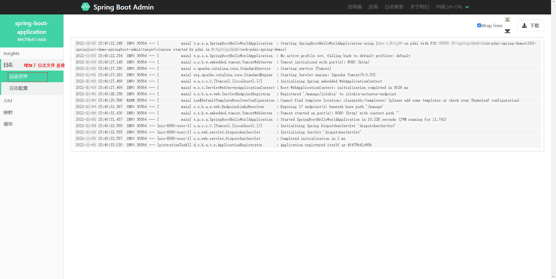 刷新SBA UI就可以看到增加了日志文件相关的连接